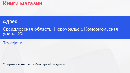 Книги, магазин по адресу Свердловская область, Новоуральск, Комсомольская улица, 23 в дальнейшем Организация, размещена в следующих категориях: