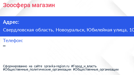 Зоосфера, магазин по адресу Свердловская область, Новоуральск, Юбилейная улица, 10 в дальнейшем Организация, размещена в следующих категориях: