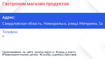 Гастроном, магазин продуктов по адресу Свердловская область, Новоуральск, улица Мичурина, 1а в дальнейшем Организация, размещена в следующих категориях: