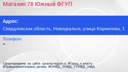 Магазин №78 Южный ФГУП по адресу Свердловская область, Новоуральск, улица Корнилова, 1 в дальнейшем Организация, размещена в следующих категориях:
