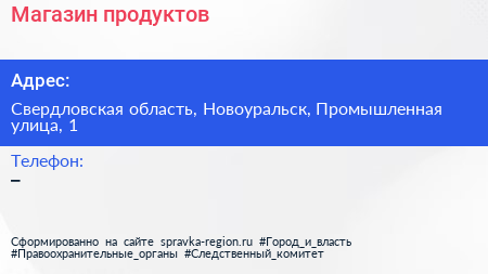 Магазин продуктов по адресу Свердловская область, Новоуральск, Промышленная улица, 1 в дальнейшем Организация, размещена в следующих категориях: