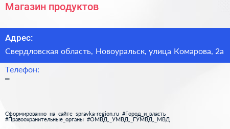 Магазин продуктов по адресу Свердловская область, Новоуральск, улица Комарова, 2а в дальнейшем Организация, размещена в следующих категориях: