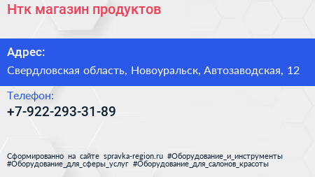 Нтк, магазин продуктов по адресу Свердловская область, Новоуральск, Автозаводская, 12 в дальнейшем Организация, размещена в следующих категориях: