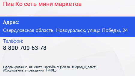 Пив & Ко, сеть мини-маркетов по адресу Свердловская область, Новоуральск, улица Победы, 24 в дальнейшем Организация, размещена в следующих категориях: