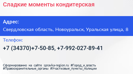 Сладкие моменты, кондитерская по адресу Свердловская область, Новоуральск, Уральская улица, 8 в дальнейшем Организация, размещена в следующих категориях: