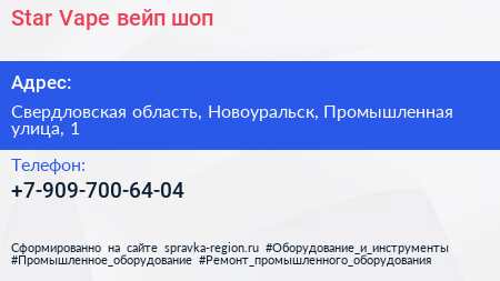 Star Vape, вейп-шоп по адресу Свердловская область, Новоуральск, Промышленная улица, 1 в дальнейшем Организация, размещена в следующих категориях: