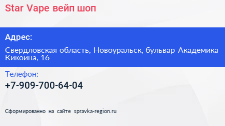 Star Vape, вейп-шоп по адресу Свердловская область, Новоуральск, бульвар Академика Кикоина, 16 в дальнейшем Организация, размещена в следующих категориях: