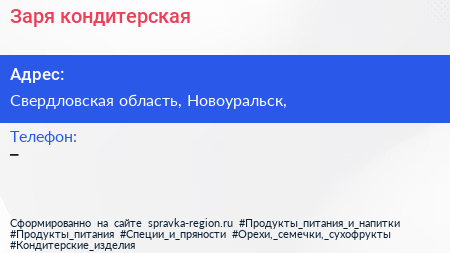 Заря, кондитерская по адресу Свердловская область, Новоуральск, в дальнейшем Организация, размещена в следующих категориях: