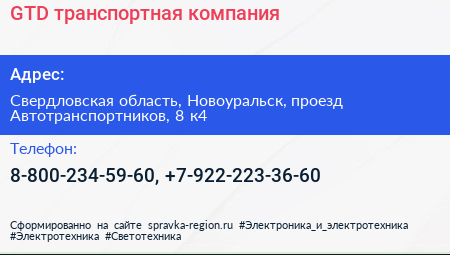 GTD, транспортная компания по адресу Свердловская область, Новоуральск, проезд Автотранспортников, 8 к4 в дальнейшем Организация, размещена в следующих категориях: