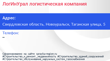 ЛогИнУрал, логистическая компания по адресу Свердловская область, Новоуральск, Таганская улица, 5 в дальнейшем Организация, размещена в следующих категориях: