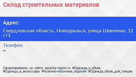 Склад строительных материалов по адресу Свердловская область, Новоуральск, улица Шевченко, 12 ст1 в дальнейшем Организация, размещена в следующих категориях: