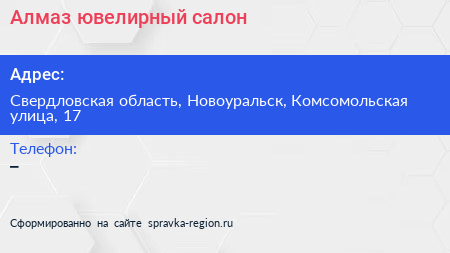 Алмаз, ювелирный салон по адресу Свердловская область, Новоуральск, Комсомольская улица, 17 в дальнейшем Организация, размещена в следующих категориях: