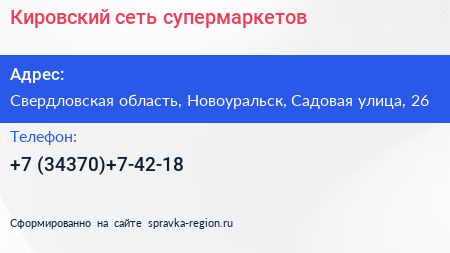 Кировский, сеть супермаркетов по адресу Свердловская область, Новоуральск, Садовая улица, 26 в дальнейшем Организация, размещена в следующих категориях: