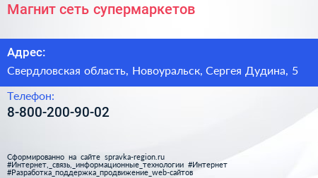 Магнит, сеть супермаркетов по адресу Свердловская область, Новоуральск, Сергея Дудина, 5 в дальнейшем Организация, размещена в следующих категориях: