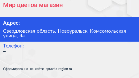 Мир цветов, магазин по адресу Свердловская область, Новоуральск, Комсомольская улица, 4а в дальнейшем Организация, размещена в следующих категориях:
