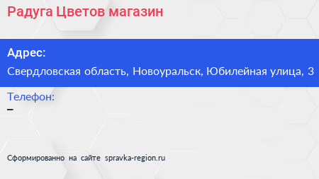 Радуга Цветов, магазин по адресу Свердловская область, Новоуральск, Юбилейная улица, 3 в дальнейшем Организация, размещена в следующих категориях: