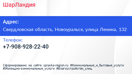 ШарЛандия по адресу Свердловская область, Новоуральск, улица Ленина, 132 в дальнейшем Организация, размещена в следующих категориях: