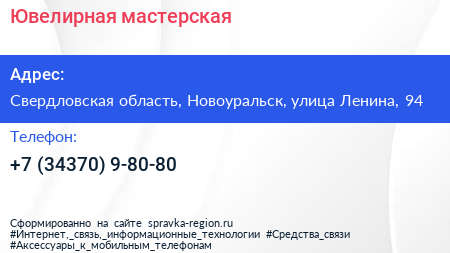 Ювелирная мастерская по адресу Свердловская область, Новоуральск, улица Ленина, 94 в дальнейшем Организация, размещена в следующих категориях: