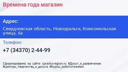 Времена года, магазин по адресу Свердловская область, Новоуральск, Комсомольская улица, 6а в дальнейшем Организация, размещена в следующих категориях: