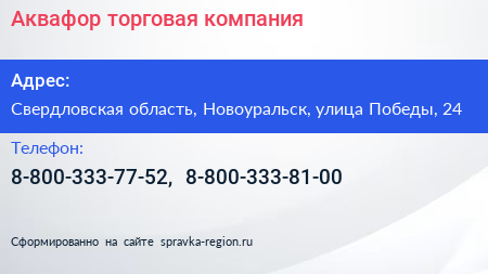 Аквафор, торговая компания по адресу Свердловская область, Новоуральск, улица Победы, 24 в дальнейшем Организация, размещена в следующих категориях: