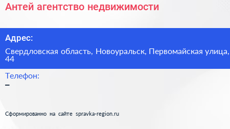 Антей, агентство недвижимости по адресу Свердловская область, Новоуральск, Первомайская улица, 44 в дальнейшем Организация, размещена в следующих категориях: