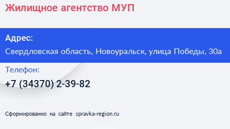 Жилищное агентство МУП по адресу Свердловская область, Новоуральск, улица Победы, 30а в дальнейшем Организация, размещена в следующих категориях: