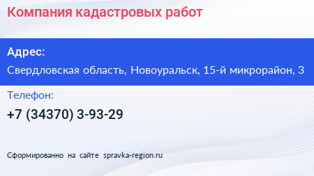 Компания кадастровых работ по адресу Свердловская область, Новоуральск, 15-й микрорайон, 3 в дальнейшем Организация, размещена в следующих категориях: