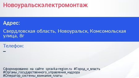 Новоуральскэлектромонтаж по адресу Свердловская область, Новоуральск, Комсомольская улица, 8г в дальнейшем Организация, размещена в следующих категориях: