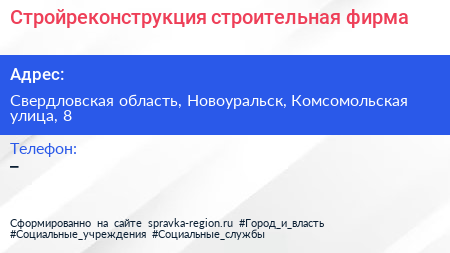 Стройреконструкция, строительная фирма по адресу Свердловская область, Новоуральск, Комсомольская улица, 8 в дальнейшем Организация, размещена в следующих категориях: