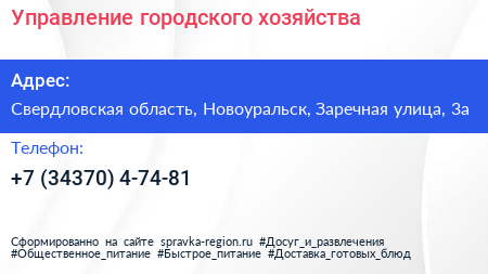 Управление городского хозяйства по адресу Свердловская область, Новоуральск, Заречная улица, 3а в дальнейшем Организация, размещена в следующих категориях: