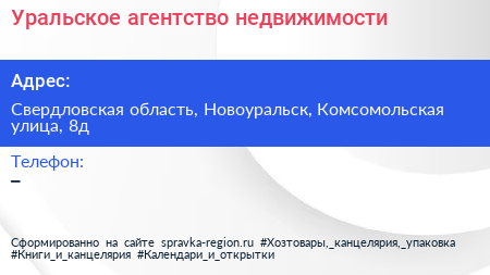 Уральское агентство недвижимости по адресу Свердловская область, Новоуральск, Комсомольская улица, 8д в дальнейшем Организация, размещена в следующих категориях: