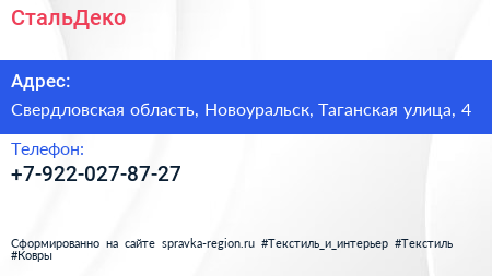 СтальДеко по адресу Свердловская область, Новоуральск, Таганская улица, 4 в дальнейшем Организация, размещена в следующих категориях: