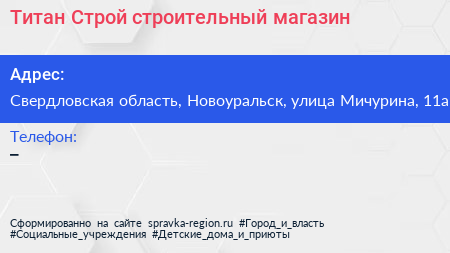 Титан-Строй, строительный магазин по адресу Свердловская область, Новоуральск, улица Мичурина, 11а в дальнейшем Организация, размещена в следующих категориях: