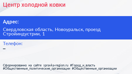 Центр холодной ковки по адресу Свердловская область, Новоуральск, проезд Стройиндустрии, 1 в дальнейшем Организация, размещена в следующих категориях: