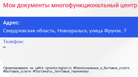 Мои документы, многофункциональный центр по адресу Свердловская область, Новоуральск, улица Фрунзе, 7 в дальнейшем Организация, размещена в следующих категориях:
