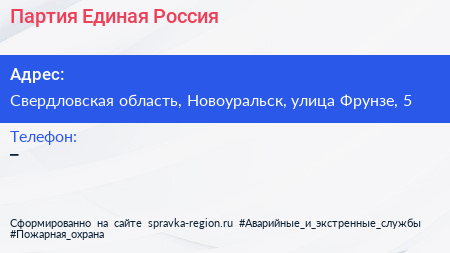 Партия Единая Россия по адресу Свердловская область, Новоуральск, улица Фрунзе, 5 в дальнейшем Организация, размещена в следующих категориях: