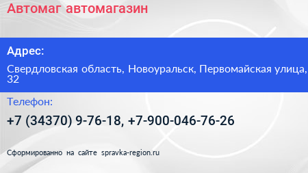 Автомаг, автомагазин по адресу Свердловская область, Новоуральск, Первомайская улица, 32 в дальнейшем Организация, размещена в следующих категориях: