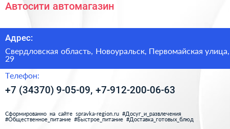 Автосити, автомагазин по адресу Свердловская область, Новоуральск, Первомайская улица, 29 в дальнейшем Организация, размещена в следующих категориях:
