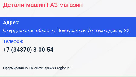 Детали машин ГАЗ, магазин по адресу Свердловская область, Новоуральск, Автозаводская, 22 в дальнейшем Организация, размещена в следующих категориях: