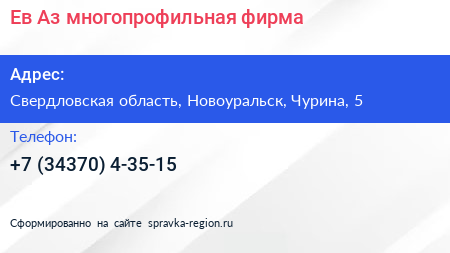 Ев-Аз, многопрофильная фирма по адресу Свердловская область, Новоуральск, Чурина, 5 в дальнейшем Организация, размещена в следующих категориях: