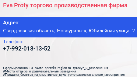 Eva Profy, торгово-производственная фирма по адресу Свердловская область, Новоуральск, Юбилейная улица, 2 в дальнейшем Организация, размещена в следующих категориях: