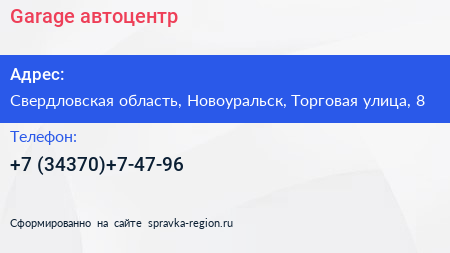 Garage, автоцентр по адресу Свердловская область, Новоуральск, Торговая улица, 8 в дальнейшем Организация, размещена в следующих категориях: