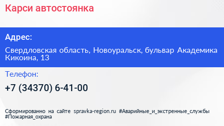 Карси, автостоянка по адресу Свердловская область, Новоуральск, бульвар Академика Кикоина, 13 в дальнейшем Организация, размещена в следующих категориях: