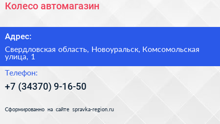 Колесо, автомагазин по адресу Свердловская область, Новоуральск, Комсомольская улица, 1 в дальнейшем Организация, размещена в следующих категориях: