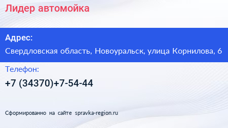 Лидер, автомойка по адресу Свердловская область, Новоуральск, улица Корнилова, 6 в дальнейшем Организация, размещена в следующих категориях: