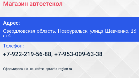 Магазин автостекол по адресу Свердловская область, Новоуральск, улица Шевченко, 16 ст4 в дальнейшем Организация, размещена в следующих категориях: