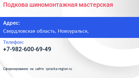 Подкова, шиномонтажная мастерская по адресу Свердловская область, Новоуральск, в дальнейшем Организация, размещена в следующих категориях: