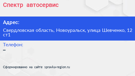 Спектр+, автосервис по адресу Свердловская область, Новоуральск, улица Шевченко, 12 ст1 в дальнейшем Организация, размещена в следующих категориях:
