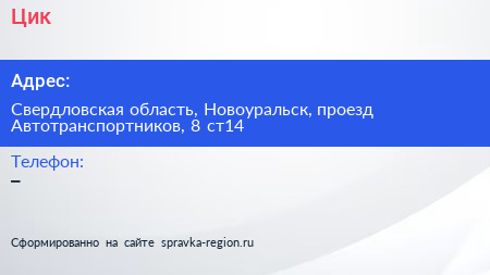 Цик по адресу Свердловская область, Новоуральск, проезд Автотранспортников, 8 ст14 в дальнейшем Организация, размещена в следующих категориях: