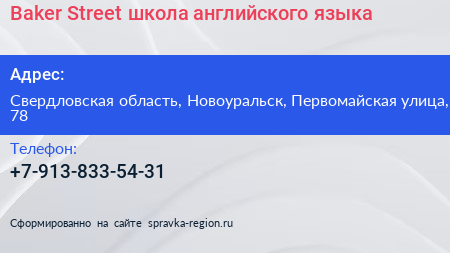 Baker Street, школа английского языка по адресу Свердловская область, Новоуральск, Первомайская улица, 78 в дальнейшем Организация, размещена в следующих категориях: